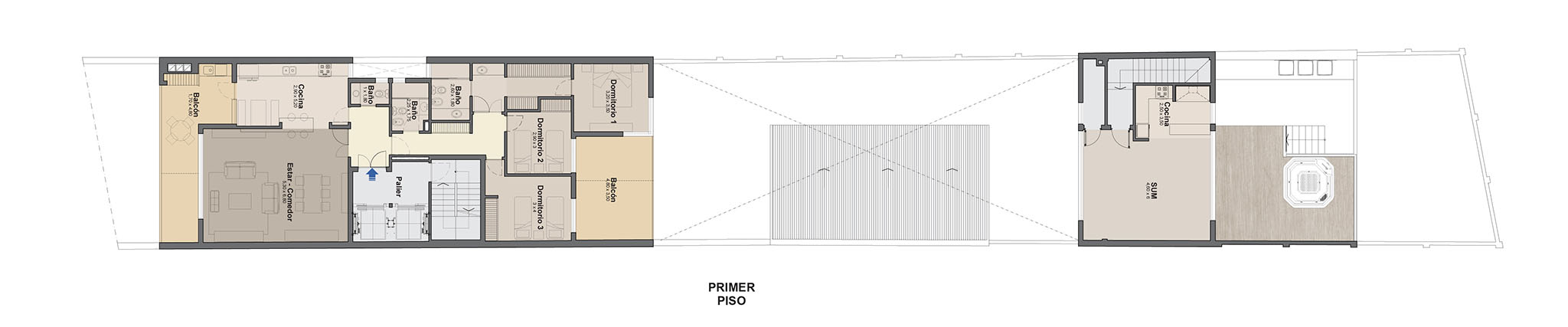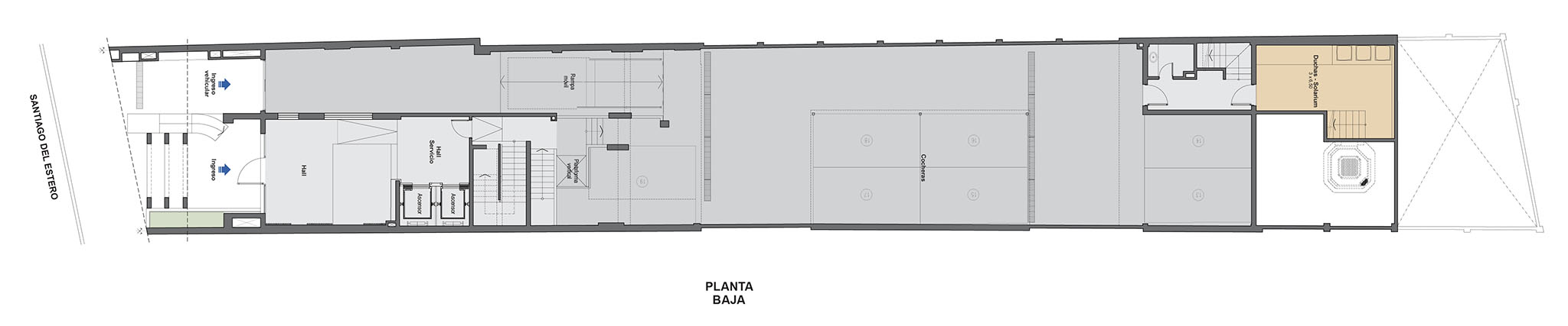 Sobre el nivel mas alto de las cocheras se incorpora un SUM con solárium de uso común.