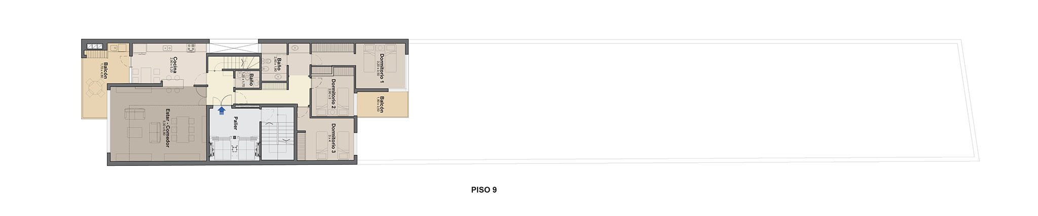Se trata de un edificio de planta baja, 1 (un) subsuelo y 10 (diez) pisos altos, compuestos por ocho departamentos de piso completo y un duplex desarrollado entre los pisos 9 y 10.