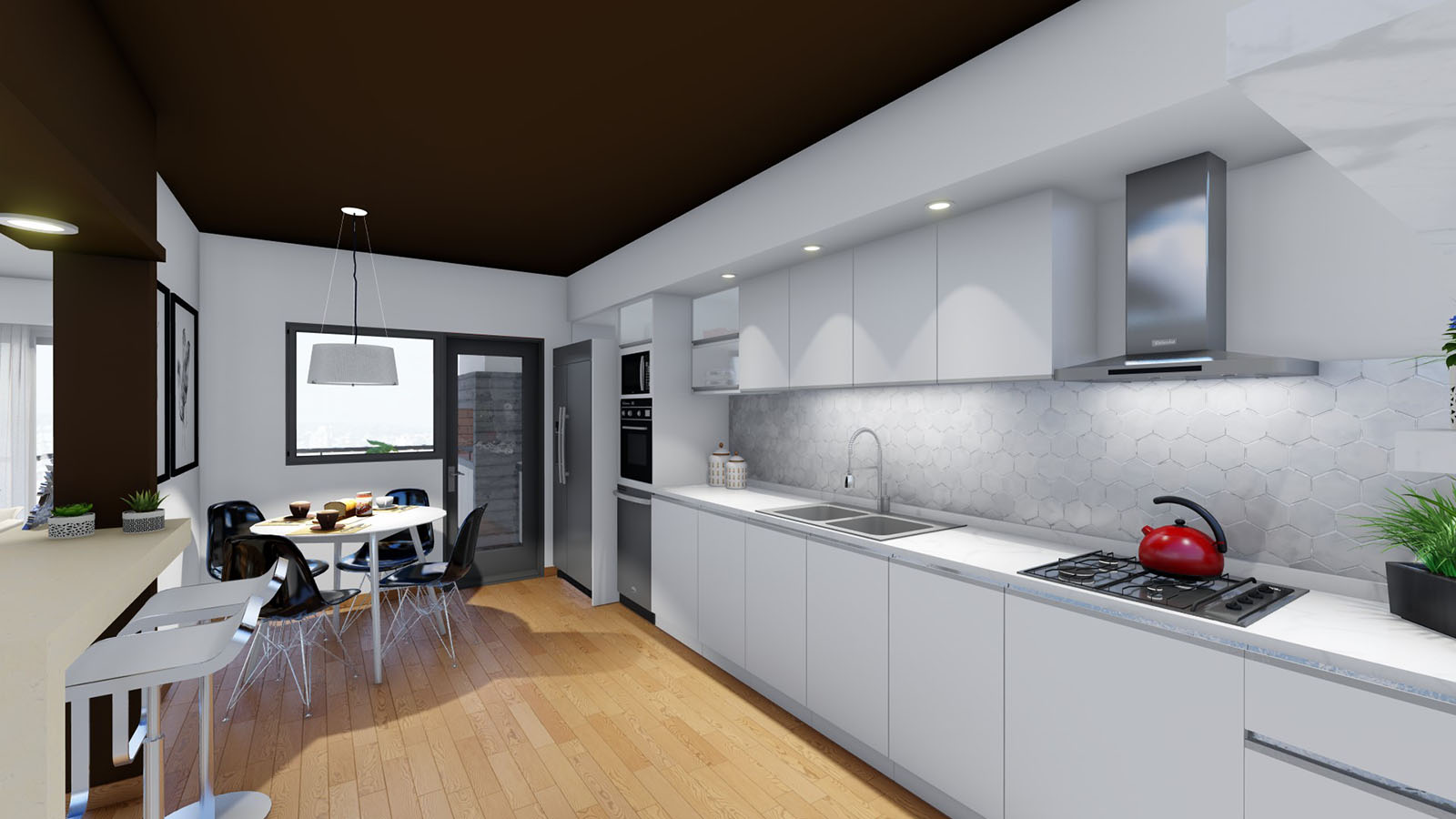 Las carpinterías serán de alta prestación con perfilería tipo Aluar A30 o similar. Las cocinas se equiparán con horno y anafe separados, campana de acero inoxidable con extractor y amoblamiento completo.